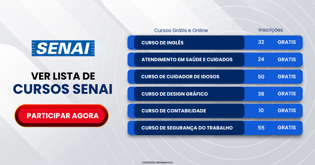 O SENAI oferece cursos gratuitos em áreas estratégicas como tecnologia, gestão, finanças, saúde, gastronomia e outros setores com alta demanda. Todos os cursos contam com certificado reconhecido, ideal para quem busca qualificação profissional gratuita.